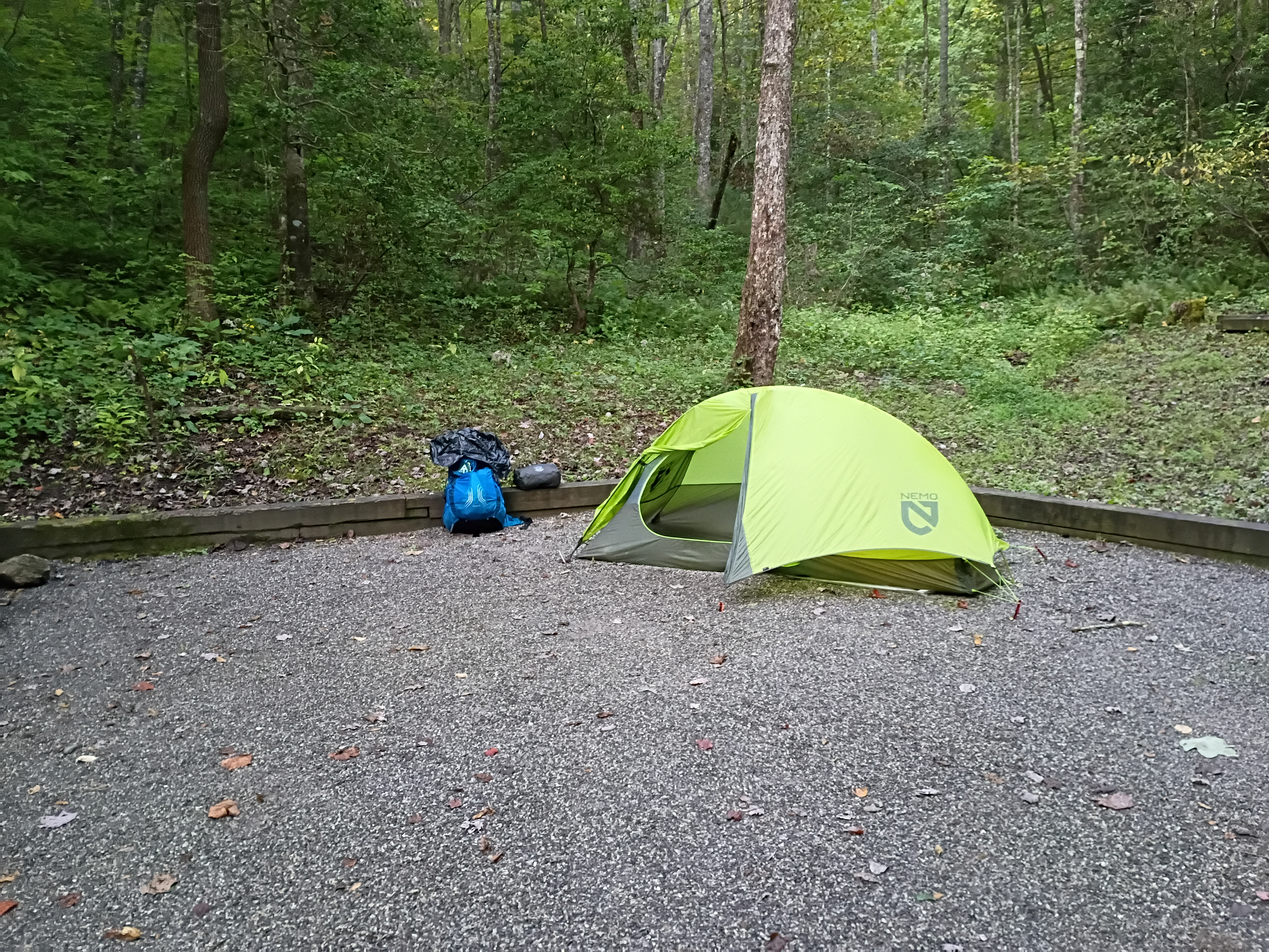 After meeting for breakfast this morning, Gab and I parked our cars at Windinf Stair Gap on Rt 64 about 11 mile outside of Franklin. My friend Gail and Sandi (and Sandi’s husband) pick us up and we drove to Lake Winfield Rec Area. I had reserved a camp site here so that where we could take a short hike to the the AT in the morning.