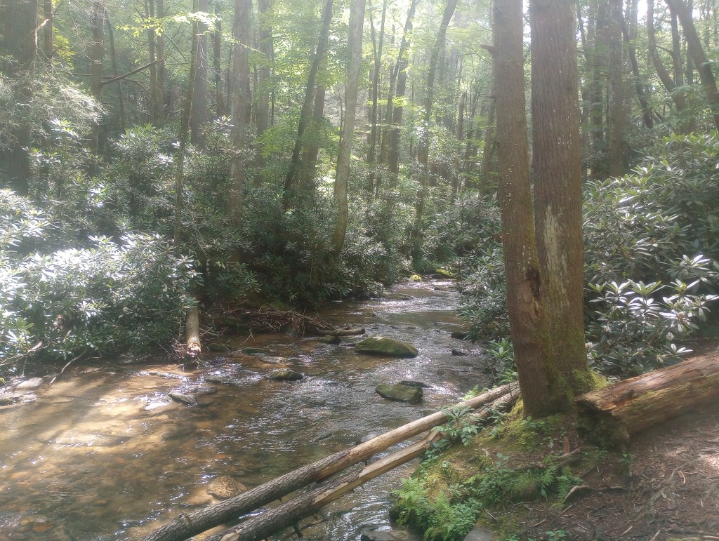 After meeting for breakfast this morning, Gab and I parked our cars at Windinf Stair Gap on Rt 64 about 11 mile outside of Franklin. My friend Gail and Sandi (and Sandi’s husband) pick us up and we drove to Lake Winfield Rec Area. I had reserved a camp site here so that where we could take a short hike to the the AT in the morning.